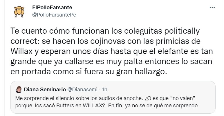 “Te cuento cómo funcionan los coleguitas politically correct: se hacen las cojinovas con las primicias de Willax y esperan unos días hasta que el elefante es tan grande que ya callarse es muy palta entonces lo sacan en portada como si fuera su gran hallazgo.” Responde Beto Ortiz desde su cuenta de Twitter