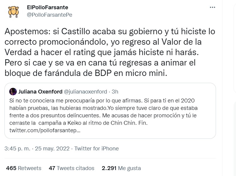 “Mi primicia data de 2020 coleguita juliana Oxenford Les canté que Pedro Castillo es un delincuente, pero no me creíste y te dedicaste a promocionarlo invitando solo a quien le reventara cohetes. Que rebotes mi primicia de 2020 es solo cuestión de días…”