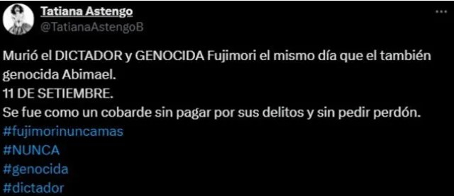 “Murió el dictador y genocida Fujimori, el mismo día que Abimael Guzmán. Se fue como un cobarde, sin pagar sus delitos ni pedir perdón”, escribió Astengo, sin medir el impacto que sus palabras podrían generar.