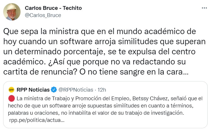 “La ministra de Trabajo y Promoción del Empleo, Betssy Chávez, señaló que el hecho de que un software arroje supuestas similitudes en cuanto a términos, palabras u oraciones, no inhabilita el valor de su trabajo de investigación” aparece en RPP Noticias.
