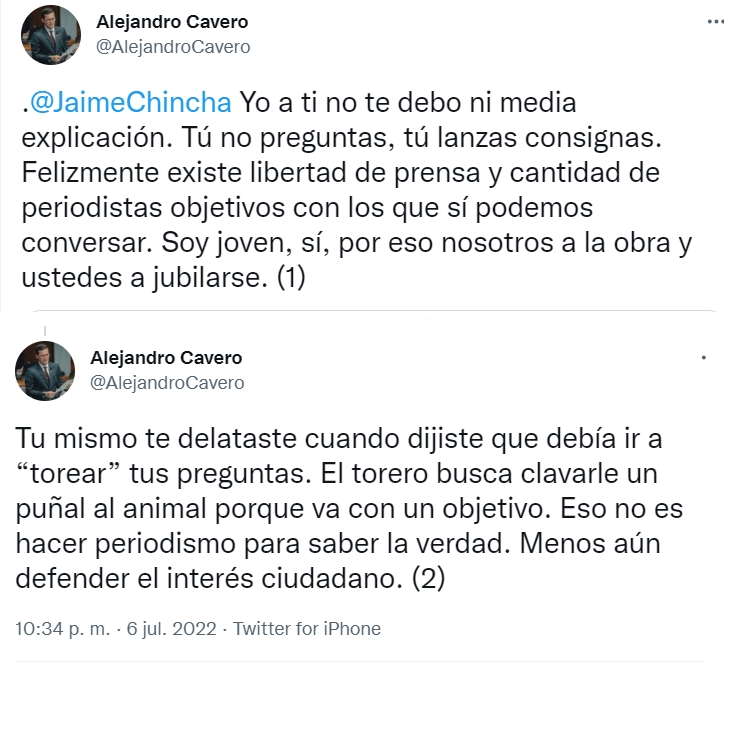 “Tu mismo te delataste cuando dijiste que debía ir a “torear” tus preguntas. El torero busca clavarle un puñal al animal porque va con un objetivo. Eso no es hacer periodismo para saber la verdad. Menos aún defender el interés ciudadano” sostuvo Cavero.