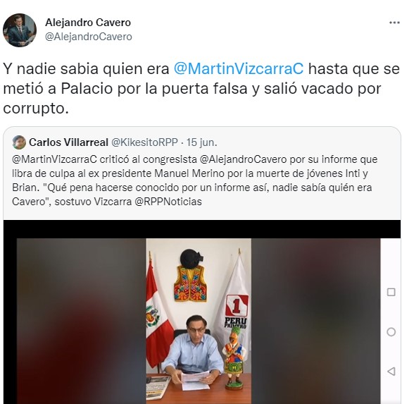 ¿Quién era el Congresista Cavero?, ¿usted lo conocía? Bueno, ahora es conocido el Congresista Cavero porque ha sacado un informe blindando a Merino, a su Premier, al Ministro del Interior, que no tomaron las decisiones adecuadas del reclamo masivo de la población” añadio Vizcarra en su video.