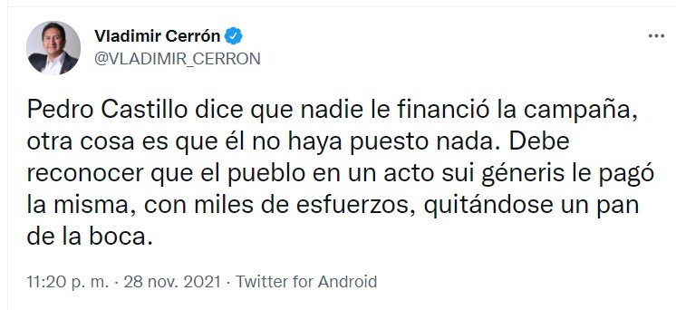 “Pedro Castillo dice que nadie le financió la campaña, otra cosa es que él no haya puesto nada. Debe reconocer que el pueblo en un acto de sui géneris le pagó la misma, con miles de esfuerzos, quitándose un pan de la boca” aseguró Vladimir Cerrón.