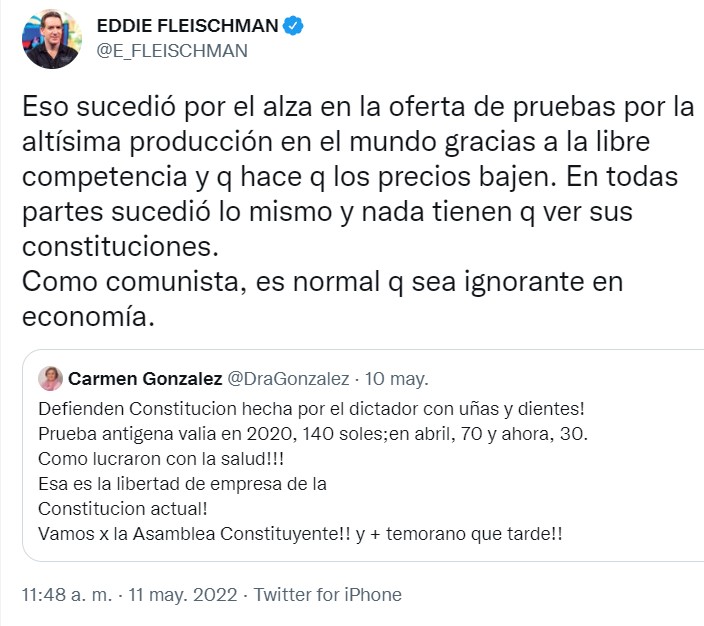 “Eso sucedió por el alza en la oferta de pruebas por la altísima producción en el mundo gracias a la libre competencia y q hace q los precios bajen. En todas partes sucedió lo mismo y nada tienen q ver sus constituciones. Como comunista, es normal q sea ignorante en economía.” Responde Fleischman desde Twitter
