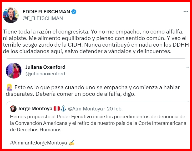 Eddie Fleischman es conocido en redes por tener una postura clara contra la caviarda y el neomarxismo internacional, en esta oportunidad tuvo que corregir a la periodista Juliana Oxenford dándole la razón al congresista Montoya y a millones de peruanos que no queremos que organismos internacionales violen nuestra soberanía pretendiendo liberar a terroristas y delincuentes juzgados por nuestro sistema de justicia.