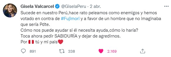 “Sucede en Nuestro Perú, hace rato p.e.l.e.a.m.o.s como enemigos y hemos votado en contra de Keiko Fujimori y a favor de un hombre que no imaginaba que sería presidente. ¿Cómo nos puede ayudar si necesita ayuda, cómo lo haría? Toca ahora pedir sabiduría y dejar de a.g.r.e.d.i.r.n.os. Por tu y mi país” enfatizó la presentadora.