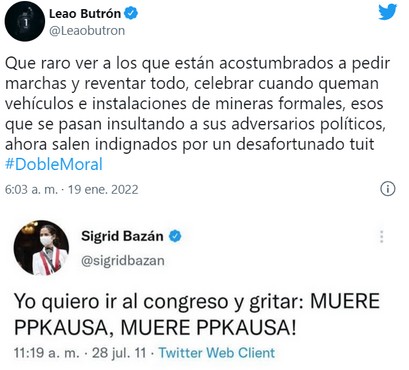 “Que raro ver a los que están acostumbrados a pedir marchas y reventar todo, celebrar cuando q.u.e.m.a.n vehículos e instalaciones de mineras formales, esos que se pasan i.n.s.u.l.t.a.n.d.o a sus adversarios políticos, ahora salen indignados por un desafortunado tuit Doble Moral” sostuvo.