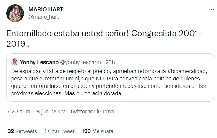 “Entornillado estaba usted señor! Congresista 2001-2019 .” respondió Mario Hart desde Twitter