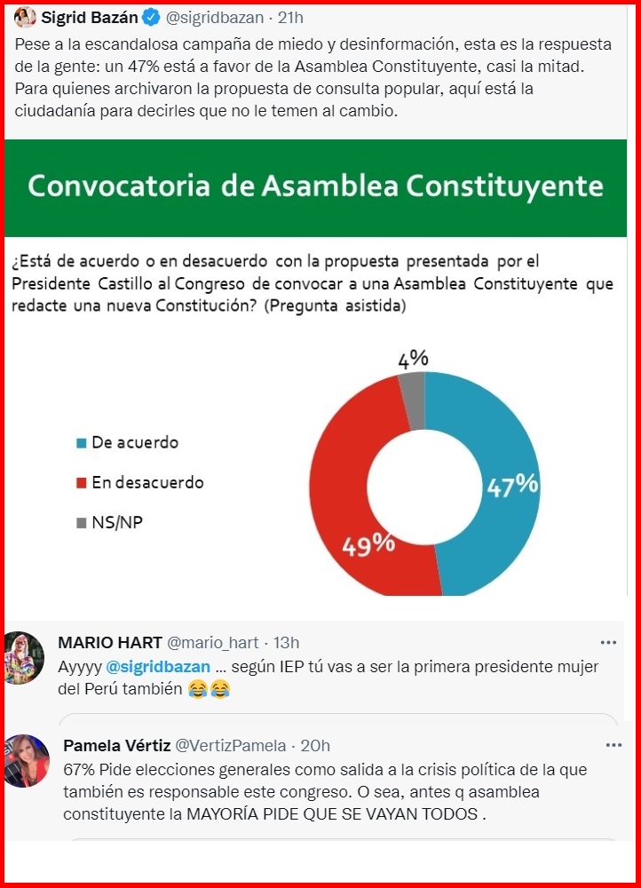 En esta oportunidad según la encuesta de (IEP) y que compartió en Twitter Bazán, supuestamente casi la mitad de los peruanos estarían de acuerdo con una asamblea constituyente.