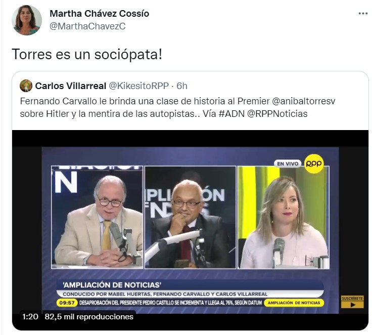 Desdé Twitter Martha Chávez llamo sociópata al primero ministro