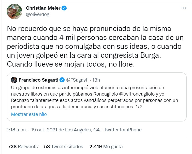 “Un grupo de extremistas interrumpió violentamente una presentación de nuestros libros en que participábamos Roncagliolo y yo. Rechazo tajantemente esos actos vandálicos perpetrados por personas con un prontuario de ataques a la democracia y sus instituciones”