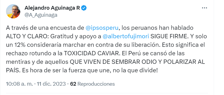 “A través de una encuesta de @ipsosperu, los peruanos han hablado ALTO Y CLARO: Gratitud y apoyo a @albertofujimori SIGUE FIRME. Y solo un 12% consideraría marchar en contra de su liberación. Esto significa el rechazo rotundo a la TOXICIDAD CAVIAR. El Perú se cansó de las mentiras y de aquellos QUE VIVEN DE SEMBRAR ODIO Y POLARIZAR AL PAÍS. ¡Es hora de ser la fuerza que une, no la que divide!” Escribe el congresista Alejandro Aguinaga en Twitter