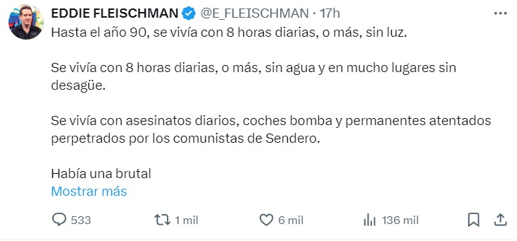 Asimismo, Fleischman resalta la violencia que imperaba en ese entonces, un flagelo encabezado principalmente por el grupo terrorista Sendero Luminoso.