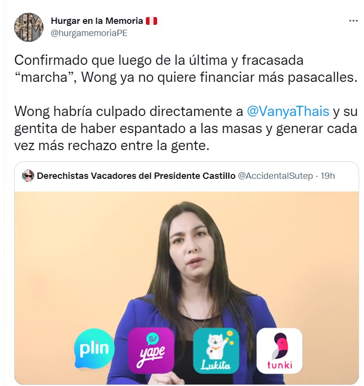 “Confirmado que luego de la última y fracasada “marcha”, Wong ya no quiere financiar más pasacalles. Wong habría culpado directamente a VanyaThais y su gentita de haber espantado a las masas y generar cada vez más rechazo entre la gente.” Se lee en al cuenta trol difamadora Hurgar de la memoria