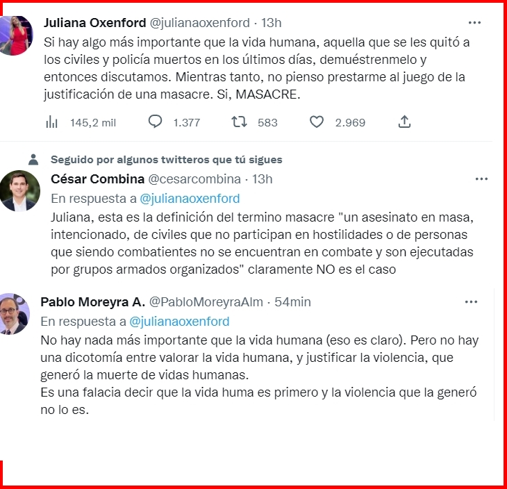 “Si hay algo más importante que la vida humana, aquella que se les quitó a los civiles y policía muertos en los últimos días, demuéstrenmelo y entonces discutamos. Mientras tanto, no pienso prestarme al juego de la justificación de una masacre. Si, MASACRE.” escribió en Twitter