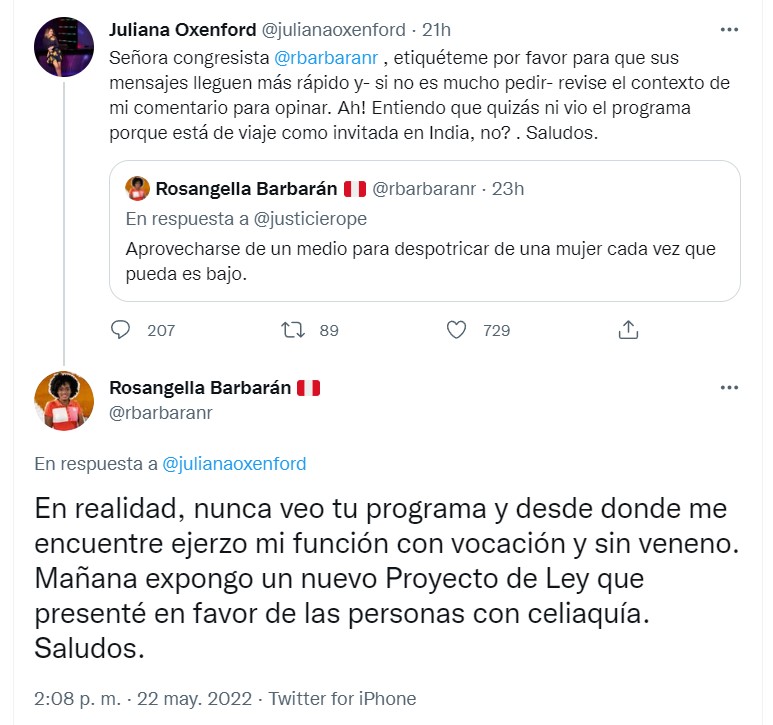 “Señora congresista, etiquéteme por favor para que sus mensajes lleguen más rápido y- si no es mucho pedir- revise el contexto de mi comentario para opinar. Ah! Entiendo que quizás ni vio el programa porque está de viaje como invitada en India, no?. Saludos”,
