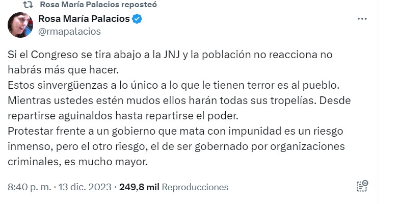 “Si el Congreso se tira abajo a la JNJ y la población no reacciona no habrás más que hacer. Estos sinvergüenzas a lo único a lo que le tienen terror es al pueblo. Mientras ustedes estén mudos ellos harán todas sus tropelías. Desde repartirse aguinaldos hasta repartirse el poder. Protestar frente a un gobierno que mata con impunidad es un riesgo inmenso, pero el otro riesgo, el de ser gobernado por organizaciones criminales, es mucho mayor.” escribió en otro tuit