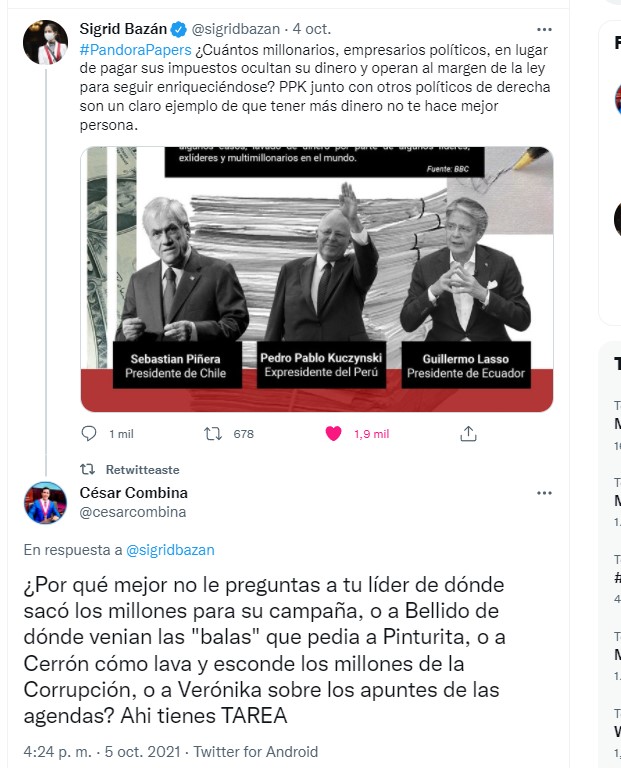 Asimismo, Fiel a su estilo la comunista Sigrid Bazán mediante un comentario publicado en Twitter alude que solo los políticos de derecha son corruptos y esconden su dinero y en doble rasero no menciona nada de los corruptos regímenes de izquierda dictatoriales en Sudamérica.