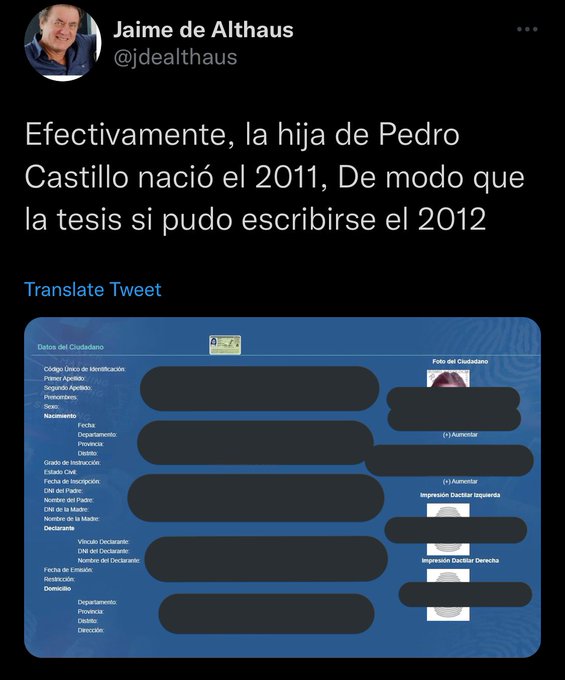 El periodismo Jaime de Althaus pudo revelar la ficha DNI de la menor hija de Castillo y donde se precisa que justamente nació el año 2011 es decir si seria posible que ya había nació para la fecha de emitirse la mencionada tesis