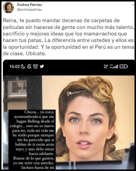 “Reina, te puedo mandar decenas de carpetas de películas sin hacerse de gente con mucho más talento, sacrificio y mejores ideas que los mamarrachos que hacen tus patas. La diferencia entre ustedes y ellos es la oportunidad. Y la oportunidad en el Perú es un tema de clase. Ubícate.” Fue el desatinado comentario de la actriz peruana con poca notoriedad Andrea Patriau