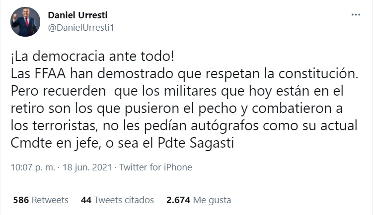 “¡La democracia ante todo! Las FFAA han demostrado que respetan la constitución. Pero recuerden que los militares que hoy están en el retiro son los que pusieron el pecho y combatieron a los terroristas, no les pedían autógrafos como su actual Cmdte en jefe, o sea el Pdte Sagasti”