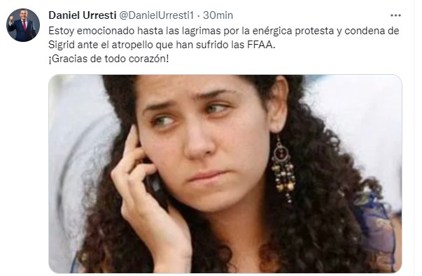 “Estoy emocionado hasta las lágrimas por la enérgica protesta y condena de Sigrid ante el atropello que han sufrido las FFAA. ¡Gracias de todo corazón!”
