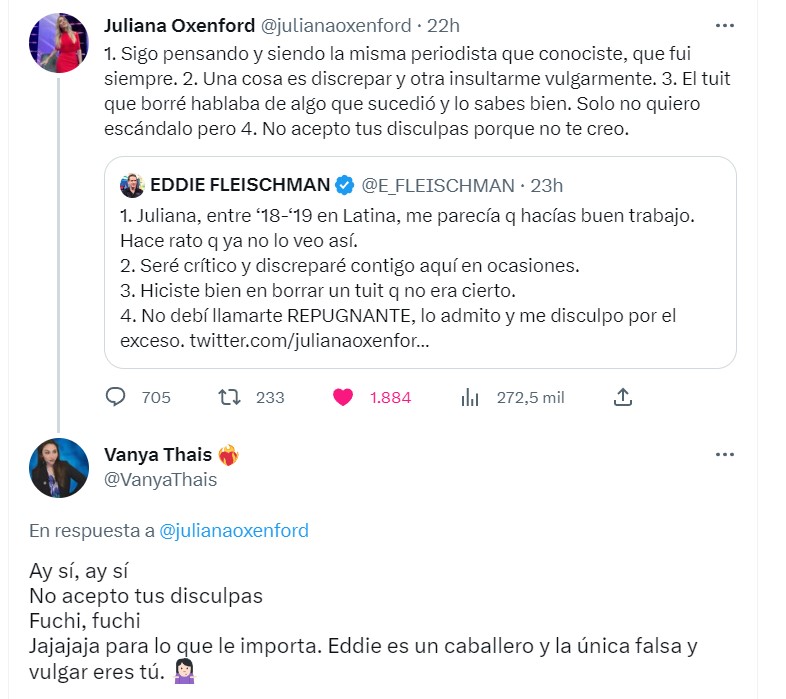 “Ay sí, ay sí No acepto tus disculpas Fuchi, fuchi Jajajaja para lo que le importa. Eddie es un caballero y la única falsa y vulgar eres tú” escribió la periodista Thais