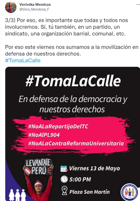“Por eso, es importante que todas y todos nos involucremos. Sí, tú también, en un partido, un sindicato, una organización barrial, comunal, etc. Por eso este viernes nos sumamos a la movilización en defensa de nuestros derechos.” Escribió en su publicación de redes sociales junto a una imagen con puntos que manifiestan estar en contra